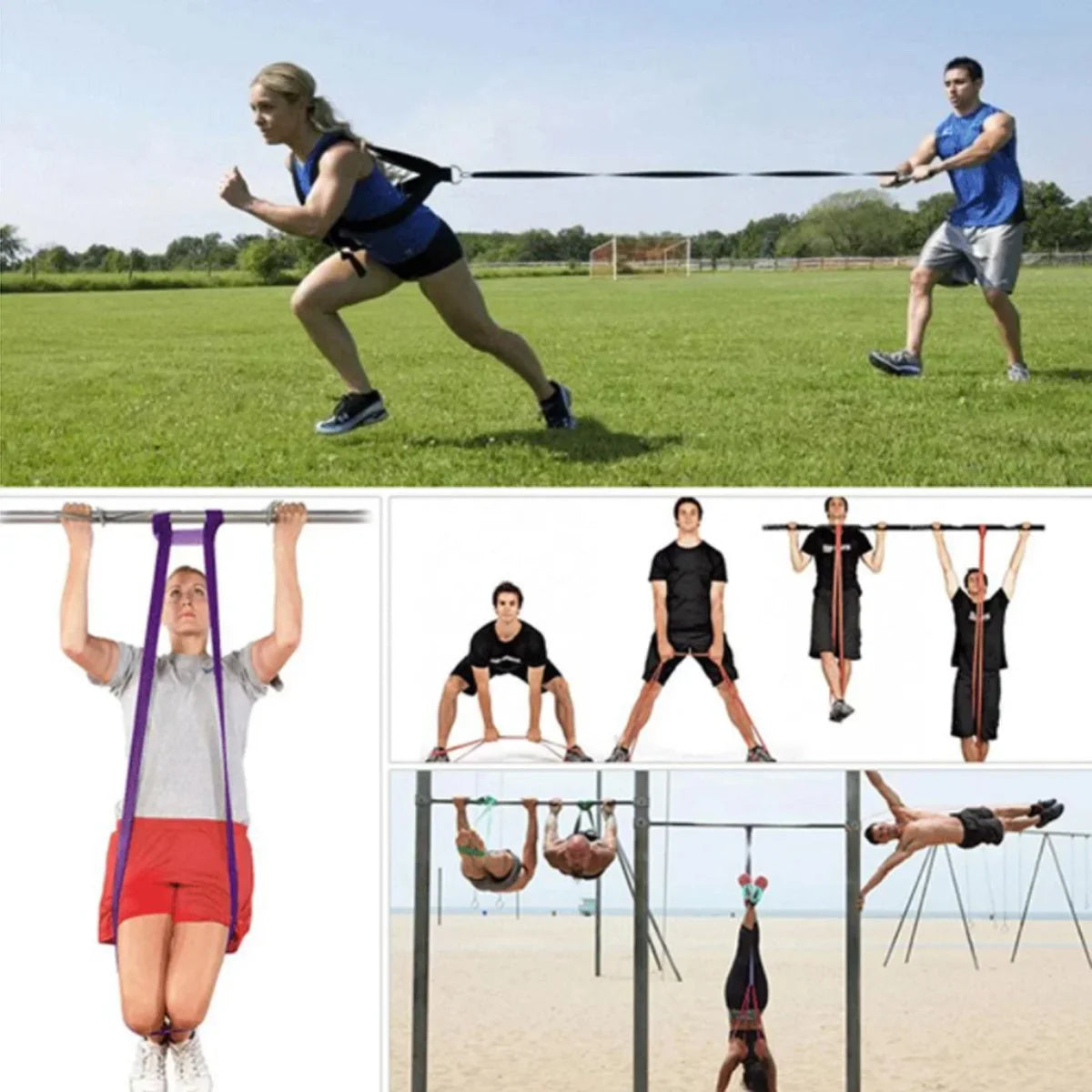 Fortalecer pernas, braços, glúteos e core com 3 faixas de resistência (leve, média e forte)